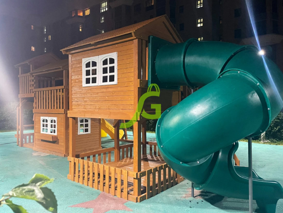 Просто огромный комплекс для детей красиво впишется в ландшафт загородного дома, его стильные башенки с белыми окошками на фоне сочной зелени украсят ваш сад. А самое главное, множество развлечений надолго отвлекут детей от вредных гаджетов, позволят выманить малышей-домоседов на свежий воздух. Разнообразные спортивные снаряды гарантированно будут воздействовать на все группы мышц мальчишек и девчонок. Ведь в площадке есть рукоход, скалодром, канат, лестницы и 4 горки для самых отважных. А для романтичных принцесс и творческих натур предусмотрены разного вида качели, доска для рисования, игра «крести-нолики» и игровой прилавок.