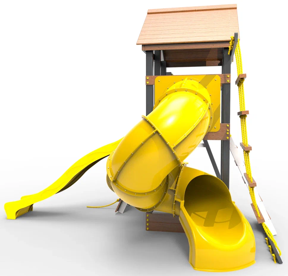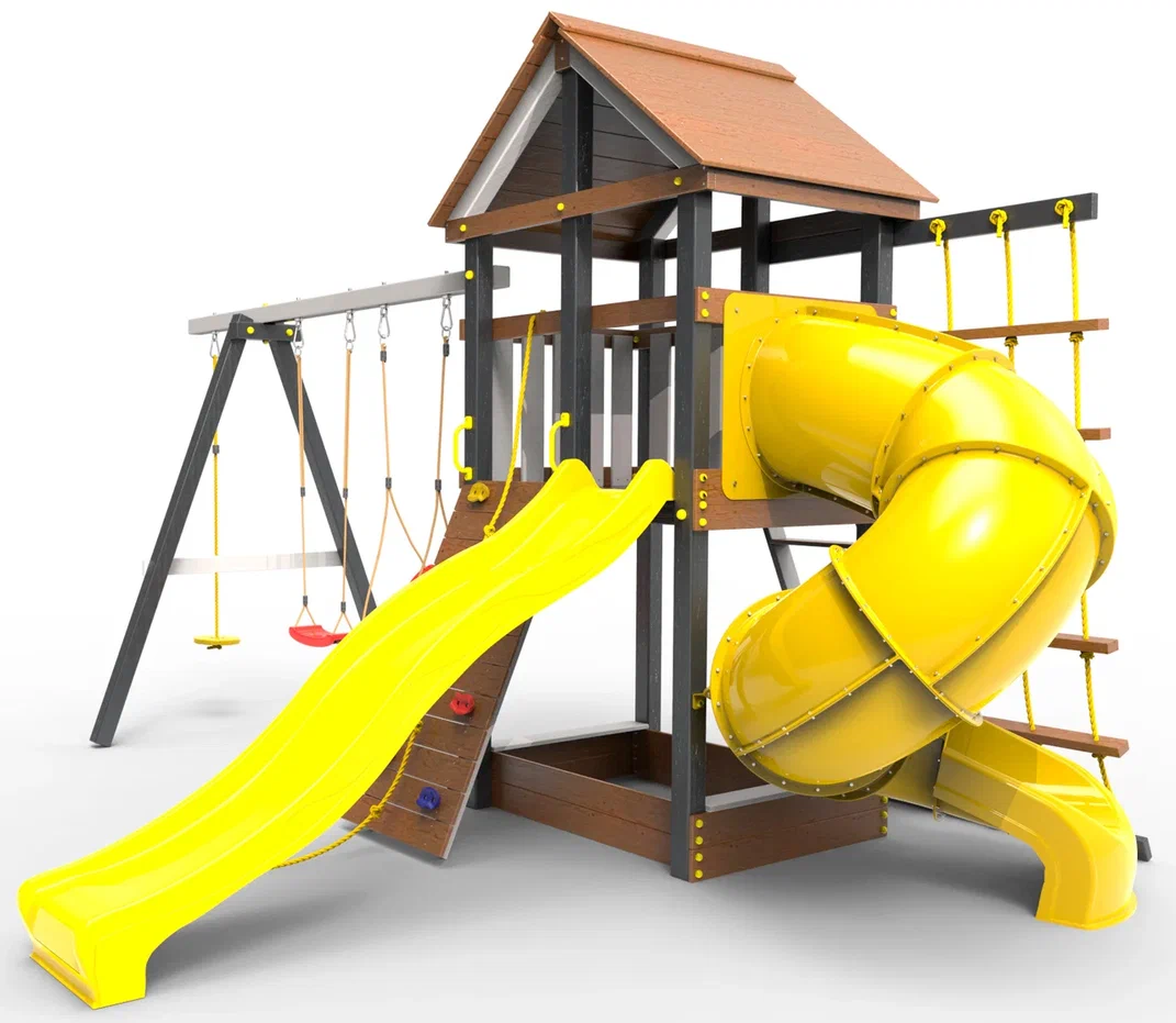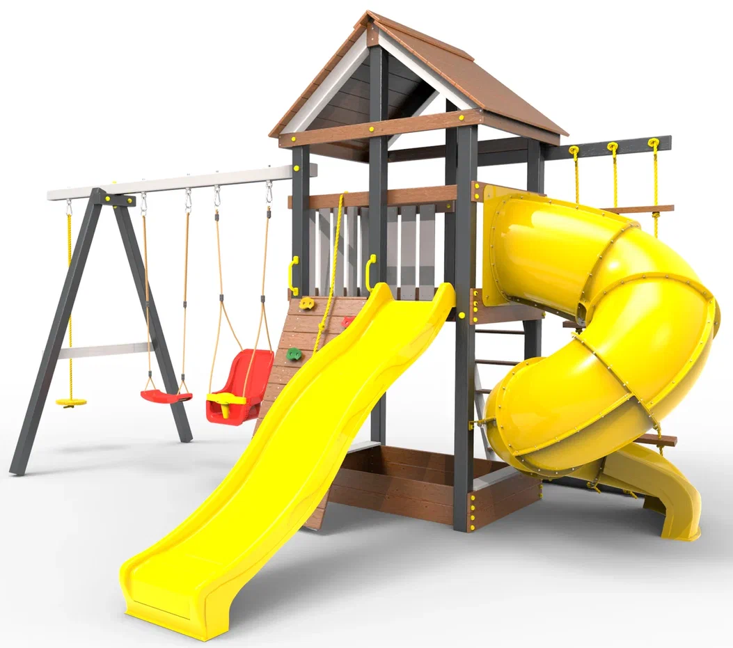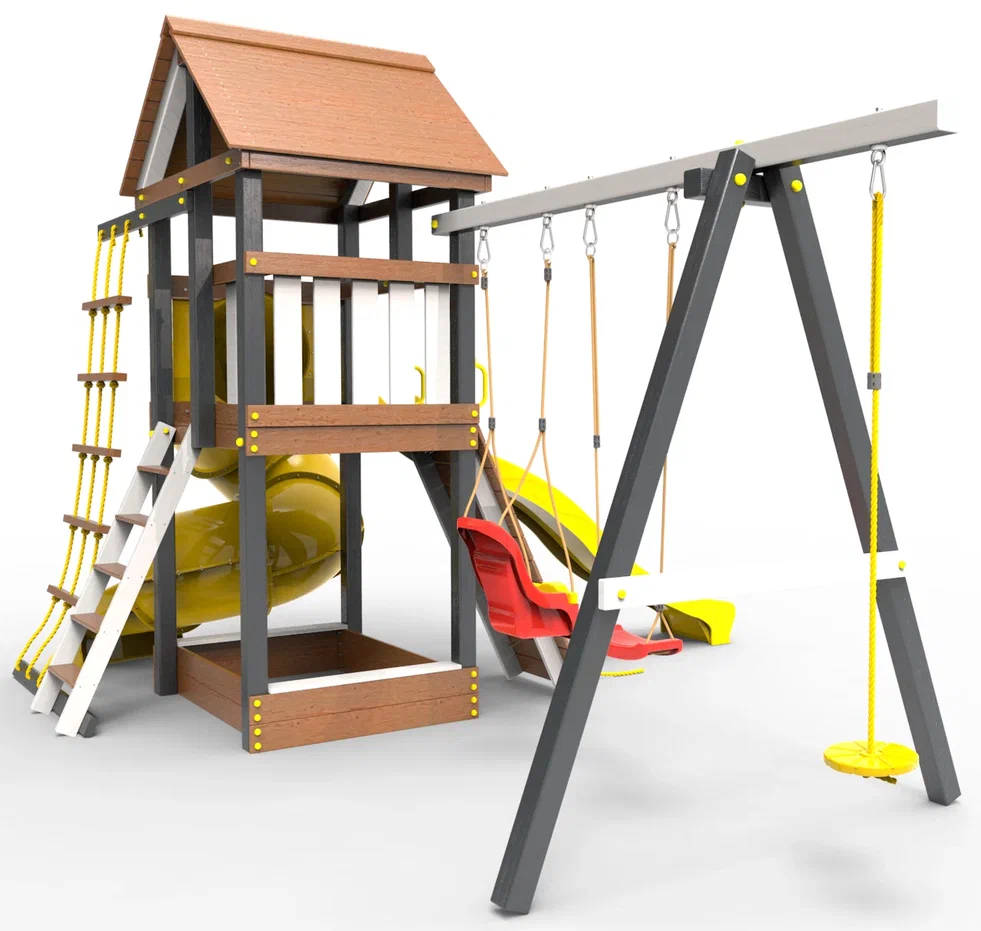 Детская площадка «Пикник Ультра 1 » представляет собой двухуровневую конструкцию, на первом уровне которой расположена песочница, а второй этаж представляет собой игровое пространство под деревянной крышей. Конструкция оснащена качельной балкой, повышенной прочности, которая имеет 5 креплений для качелей или любого другого навесного оборудования, шторм-трапом , двумя горками и скалодромом! .