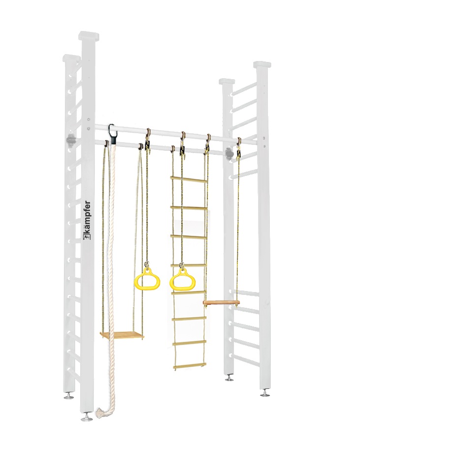 Конструкция выполнена из натурального дерева стойки и ступени, все края деталей немного скруглены обеспечивая большую безопасность для ребенка. Перекладины для навесного оборудования -металлические.