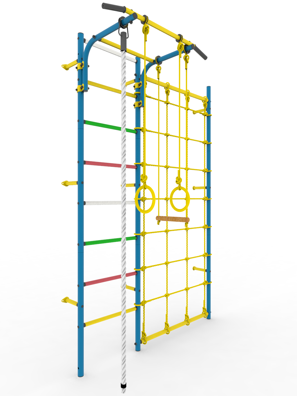- Комплектация: турник (регулируемый по высоте), кольца гимнастические, канат, трапеция, сетка