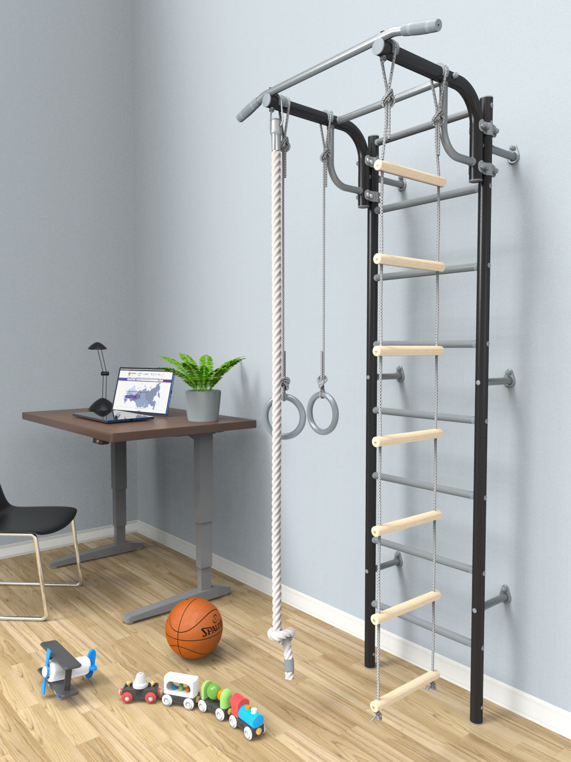 Состав комплекса: 1) шведская лестница; 2) турник регулируемый по высоте; 3) кольца гимнастические; 4) канат; 5) трапеция.