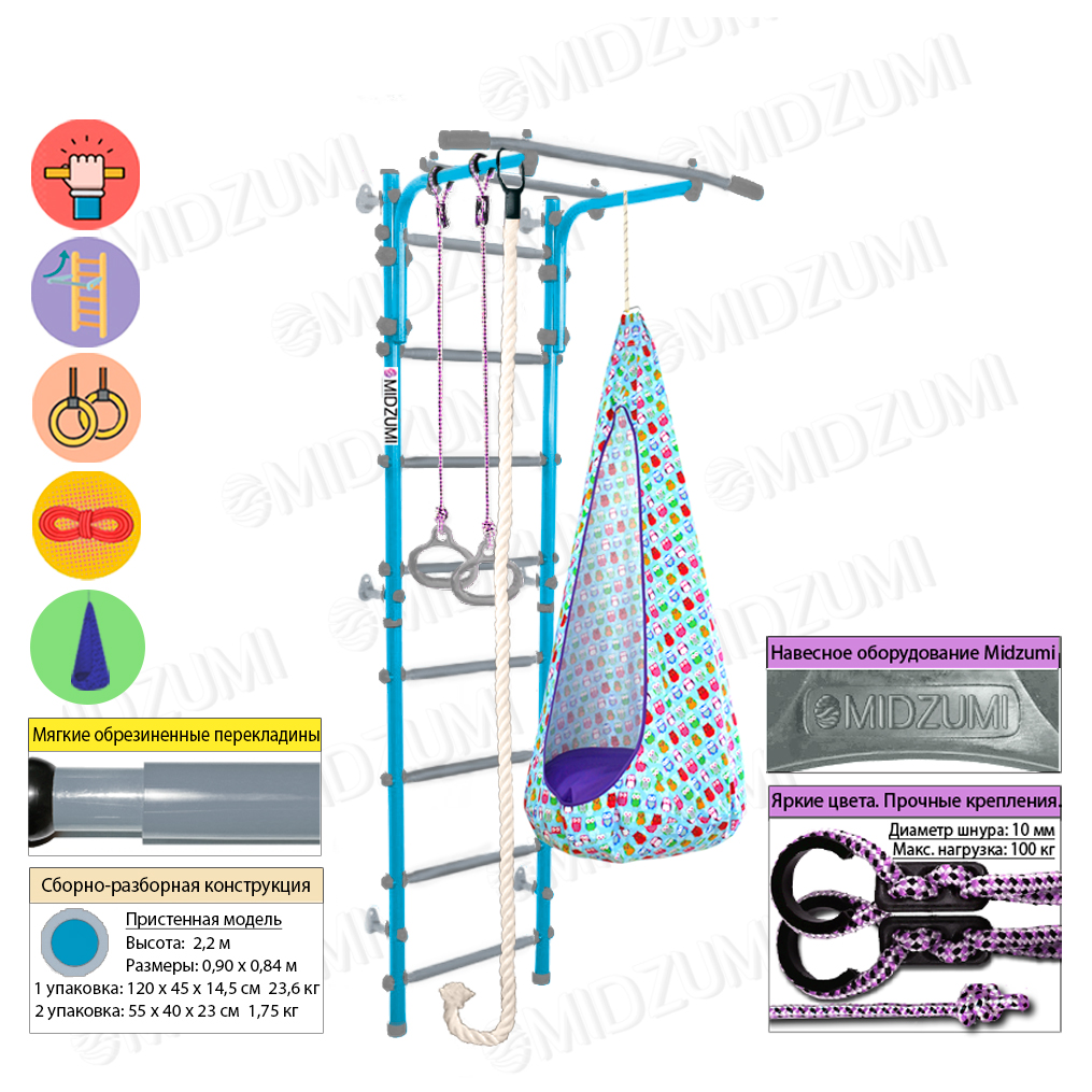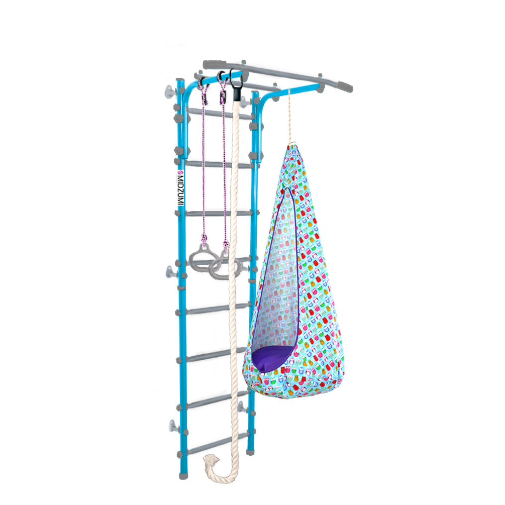 Комплектация: основа - металлическая шведская стенка с турником, гимнастические кольца, канат, качели-кокон.