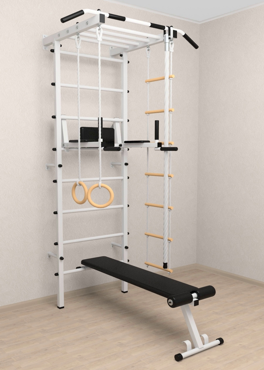 - комплект: канат с крепежом, кольца гимнастические деревянные, лестница веревочная