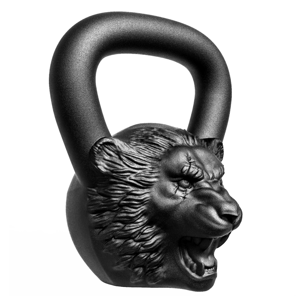 Гиря Лев. Цвет — черный или медный, вес 18 килограммов. Выполнена в виде головы льва. Ручка удобна для хвата, гиря хорошо сбалансирована.