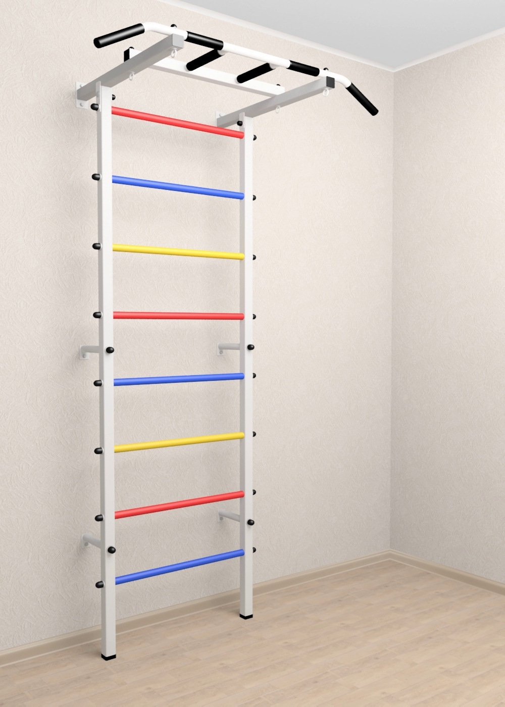 Стойки шведской стенки Sv Pro изготовлены из профильной трубы 40х40х2 мм. Ступени изготовлены из круглой, стальной трубы, покрытой резиной (не скользят, не натирают мозоли, не прокручиваются, не имеют запаха, приятны на ощупь). Устанавливается к стене при помощи 6 кронштейнов. Турник в шведской стенке Sv Pro изготовлен из профильной трубы 40х40х2 мм и круглой трубы D30 мм. На перекладину, в местах хватов, одеты резиновые ручки.
